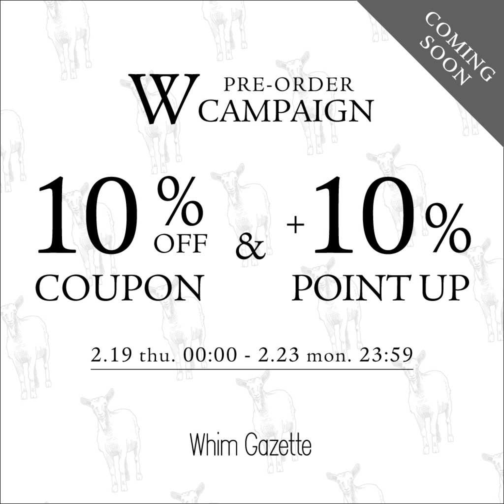 【予告】予約アイテム10%OFFクーポン&+10%ポイント還元Wキャンペーン2026.2.17 ウィム ガゼットでは、2月19日(木)00:00から2月23日(月)23:59までの5日間限定で、予約商品に使える10%OFFクーポン&+10%ポイント還元のWキャンペーンを開催いたします! 完売していた人気アイテムの追加や、新しいシーズンの訪れを感じる予約アイテムを最大限にお得に手に入れられるチャンスです。 この機会に、ぜひお買い物をお楽しみください。 詳しくはこちら>> RECENT NEWS 2026.02.17【LIVE】2/19(木)21:00~配信!予約10%OFFキャンペーンおすすめアイテムのご紹介 2026.02.17【Drawing Numbers】先行予約がスタート!! 2026.02.17【予告】予約アイテム10%OFFクーポン&+10%ポイント還元Wキャンペーン 2026.02.17【PRE ORDER】軽やかなムード漂う、新作コレクション 2026.02.15【WEEKLY RANKING】「パルクロ春一番」今週の人気アイテムTOP10!
