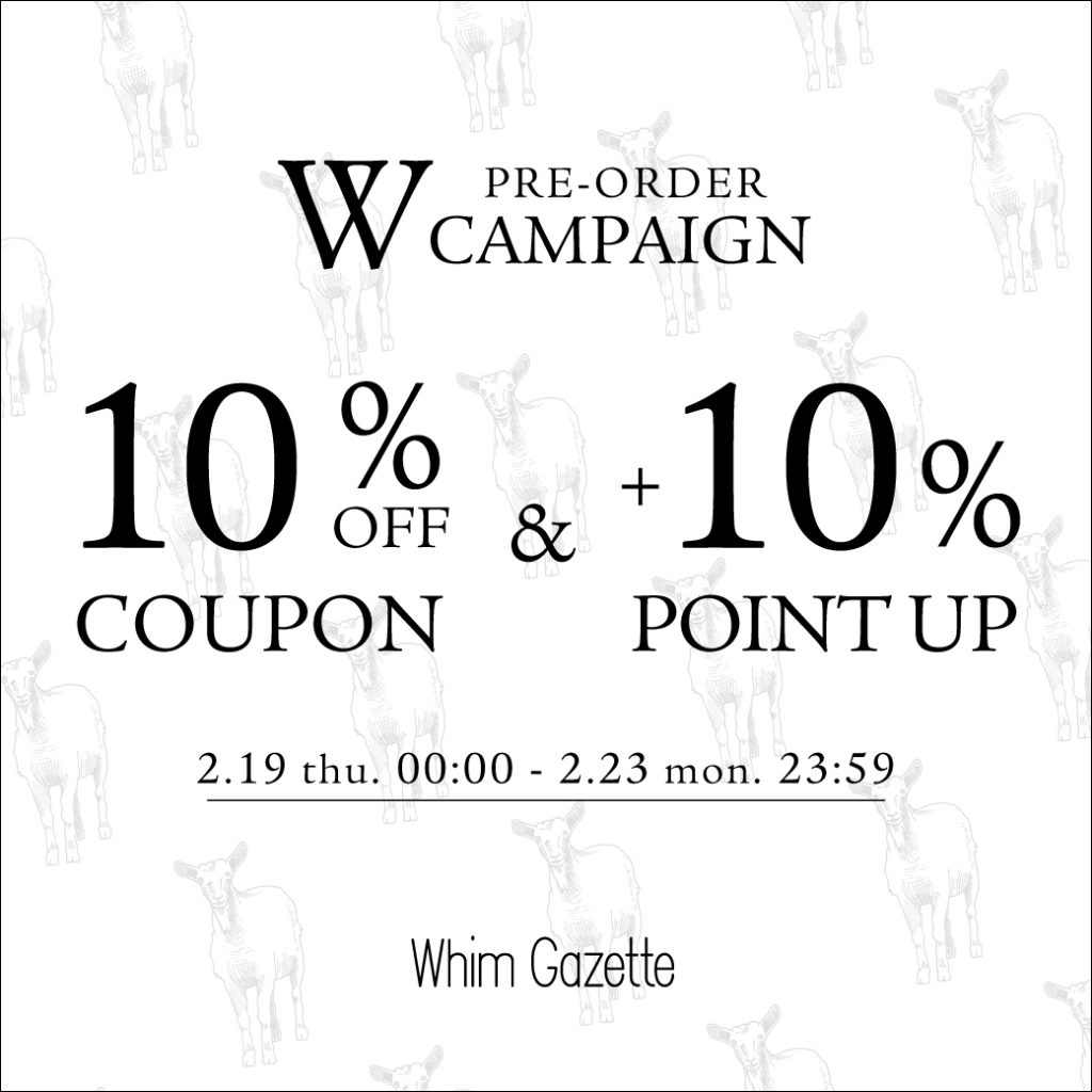 【5日間限定】予約アイテム10%OFFクーポン&+10%ポイント還元Wキャンペーン2026.2.19 ウィム ガゼットでは、2月19日(木)00:00から2月23日(月)23:59までの3日間限定で、予約商品に使える10%OFFクーポン&+10%ポイント還元のWキャンペーンを開催いたします! 完売していた人気アイテムの追加や、新しいシーズンの訪れを感じる予約アイテムを最大限にお得に手に入れられるチャンスです。 この機会に、ぜひお買い物をお楽しみください。 詳しくはこちら>> RECENT NEWS 2026.02.19【Drawing Numbers】先行予約がスタート!! 2026.02.19【5日間限定】予約アイテム10%OFFクーポン&+10%ポイント還元Wキャンペーン 2026.02.17【LIVE】2/19(木)21:00~配信!予約10%OFFキャンペーンおすすめアイテムのご紹介 2026.02.17【Drawing Numbers】先行予約がスタート!! 2026.02.17【予告】予約アイテム10%OFFクーポン&+10%ポイント還元Wキャンペーン