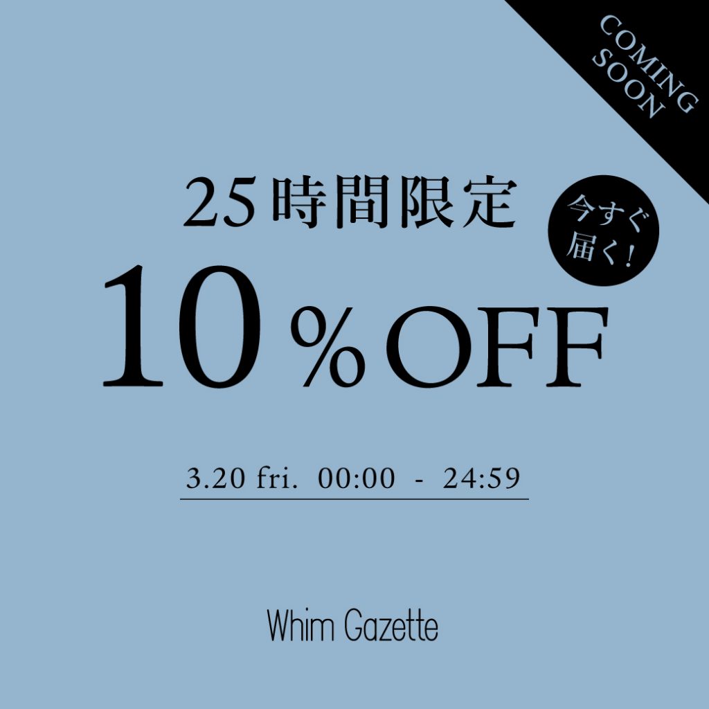 \明日から/【25時間限定】今すぐ届くアイテムに使える10%OFFクーポンキャンペーン!2026.3.19 ウィム ガゼットでは、3月20日(金)00:00から3月21日(土)00:59までの25時間限定で、ウィム ガゼットパルクローゼット店で使える10%OFFクーポンキャンペーンを開催します。 入荷したばかりの新作や、今すぐお届け可能なアイテムが対象です。 この機会に、ぜひお買い物をお楽しみください! 有効期間:3月20日(金)00:00~3月21日(土)00:59 詳しくはこちら>> RECENT NEWS 2026.03.19\明日から/【25時間限定】今すぐ届くアイテムに使える10%OFFクーポンキャンペーン! 2026.03.19【4日間限定】先行予約アイテム10%OFFクーポン配信! 2026.03.17【LIVE】3/19(木) 21:00~配信!予約10%OFFキャンペーンおすすめアイテムのご紹介 2026.03.17\予告/【4日間限定】先行予約アイテム10%OFFクーポン配信! 2026.03.17【PRE ORDER】女性らしいフォルムが引き立つ、新作コレクション