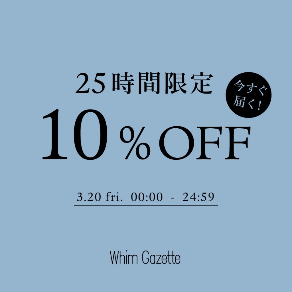 【25時間限定】今すぐ届くアイテムに使える10%OFFクーポンキャンペーン!2026.3.20 ウィム ガゼットでは、3月20日(金)00:00から3月21日(土)00:59までの25時間限定で、ウィム ガゼットパルクローゼット店で使える10%OFFクーポンキャンペーンを開催します。 入荷したばかりの新作や、今すぐお届け可能なアイテムが対象です。 この機会に、ぜひお買い物をお楽しみください! 有効期間:3月20日(金)00:00~3月21日(土)00:59 詳しくはこちら>> RECENT NEWS 2026.03.20STAFF COORDINATE × おすすめの予約アイテムをチェック! 2026.03.20【3/27(金)12:00~】@wg_togashi / コラボブラウスが登場! 2026.03.20【25時間限定】今すぐ届くアイテムに使える10%OFFクーポンキャンペーン! 2026.03.19\明日から/【25時間限定】今すぐ届くアイテムに使える10%OFFクーポンキャンペーン! 2026.03.19【4日間限定】先行予約アイテム10%OFFクーポン配信!